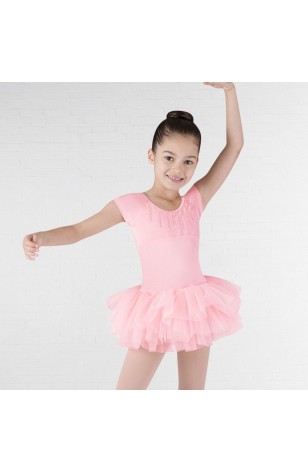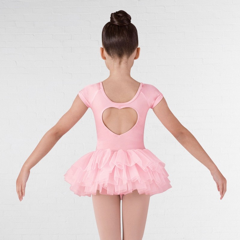 This beautiful capped sleeve tutu has an ultra soft meryl top with a pretty cut out heart back detail with dot mesh insert
